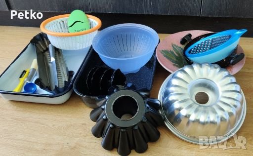 Повечето от нещата са нови като двете тави, двата гевгира, синьото ренде, 4-те черни десертни купички, зелената ръкохватка, другите неща са използвани. Бялата кексова форма е продадена. Цената за всичко е 90 лв. Ако ви интересува нещо конкретно пишете и ще се разберем за цена.