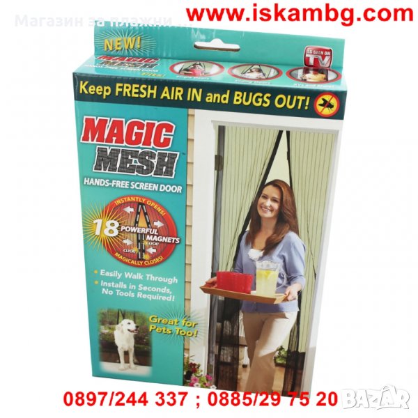 Magic Mesh е мрежа за насекоми с магнитно закопчаване посредтвом 14 мощни магнита. С нея в дома ви ще влиза единствено свеж въздух. Тайната е в здравата мрежеста тъкан. Тя блокира досадните насекоми, без да вреди на тях или на околната среда. Благодарение магнитните закопчалки, разположени на стратегически места, всички могат да влизат и излизат свободно. Ако ръцете ви са заети, мрежата с нейното магнитно закопчаване ще се затвори автоматично след вас. Спестете пари и се наслаждавайте спокойно на свежия въздух.