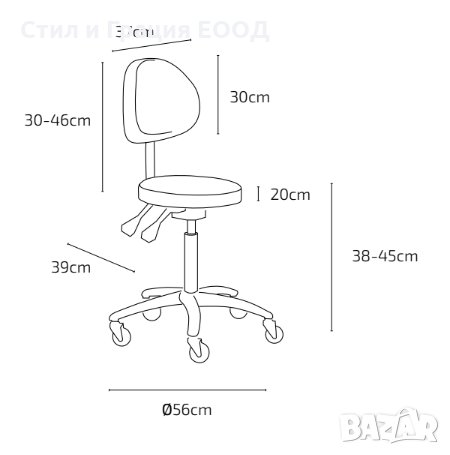 да се регулира височината 38/45 см , наклона на облегалката и наклона на седалката