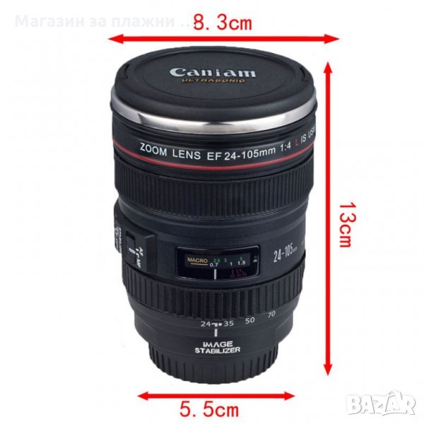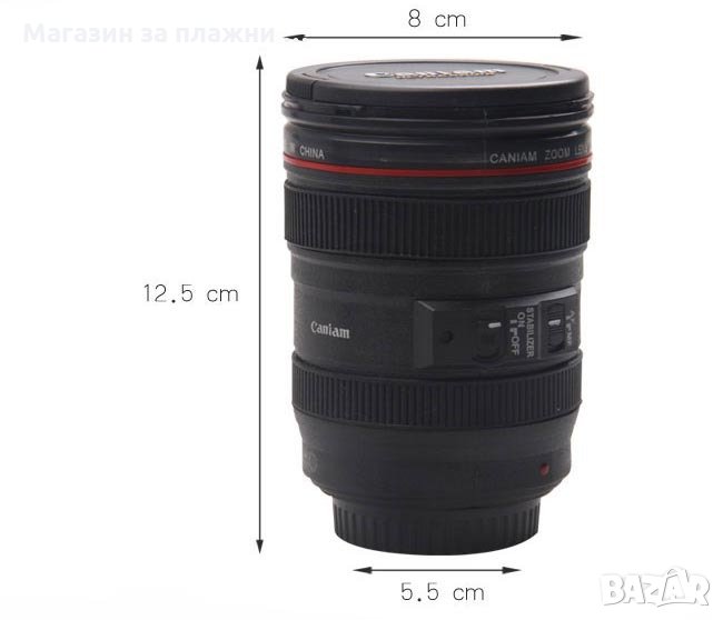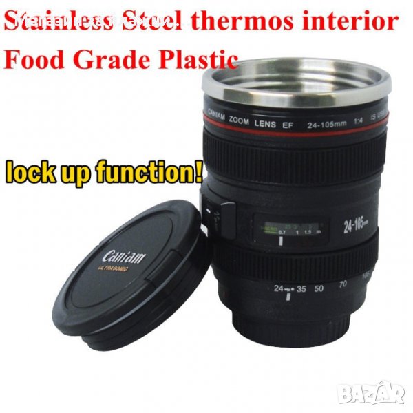 Забавна и интересна термо чаша във формата на обектив - Caniam с капак. Със специална изолационна конструкция, вътрешност от неръждаема стомана и пластмаса отвънка. Може да се използва като чаша, кутия за пари и други. Чашата е страхотен подарък, за любителите на фотографирането. Изненадайте Ваш приятел с този прекрасен подарък.