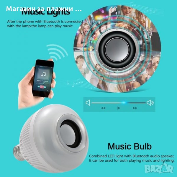 Представяме ви LED лампа с Bluetooth контрол и високоговорител. Можете да контролирате светлината или високоговорителя на устройството, чрез приложение за iOS или ANDROID. След като инсталирате приложението на вашето SMART устройство, трябва да се свържете лампата с Bluetooth към телефона или таблета си. Вече контролът е Ваш. Благодарение на вграденият говорител тази лампа е тонколона на телефонът Ви. След като нагласите светлината по Ваш вкус, можете да си пуснете любимата музичка от телефона и остава само да се отпуснете.