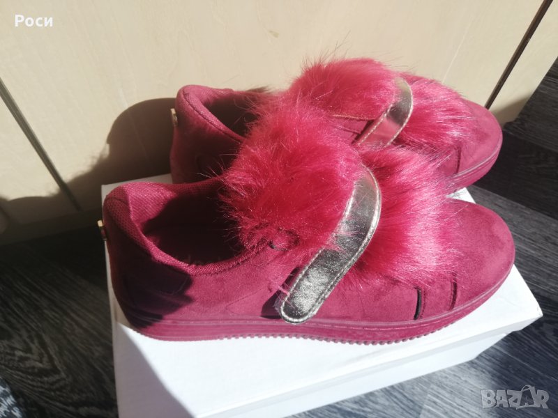Нови дамски обувки във винено червен цвят и декорация от пух в горната част на обувката, велкро закопчаване от горната страна и еластични отвътрешната, номер 38 със стелка 24 см..