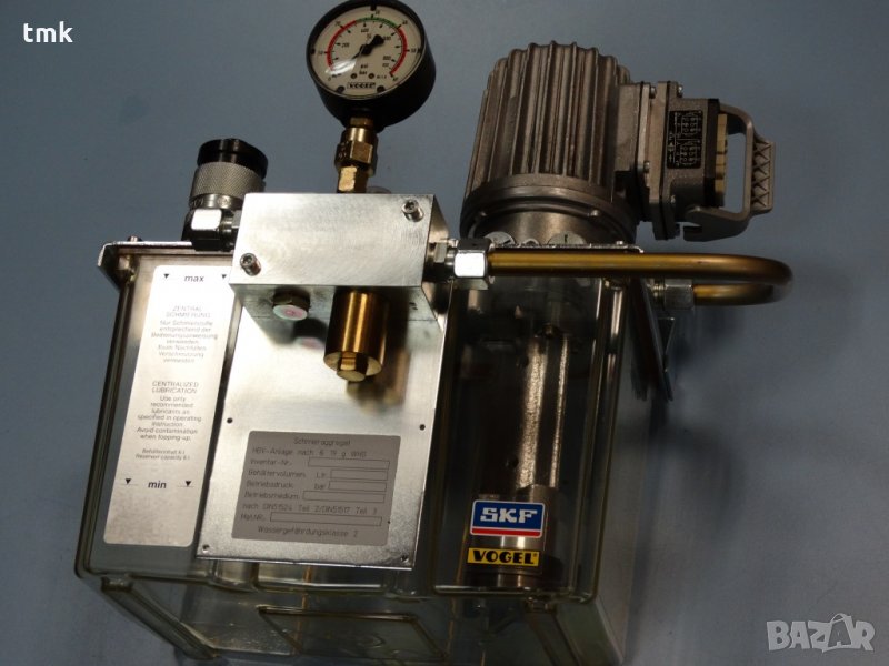 Фирма "Техно Маш Комплект" ЕООД предлага нова, немска смазочна станция, производство на SKF Vogel с манометър и 6-литров резервоар. Станцията е със следните технически параметри: