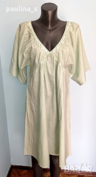 Moda". Цената е крайна 39,99лв. Рокля от много фин индийски памук с богата ръчна декорация на деколтето. Материята е фин индийски памук с % ликра и има еластичност. Ръкавите са 7/8, прилеп, набор има в чашите за бюста и под торса. По желание може да се носи и като туника. Не е обличана.