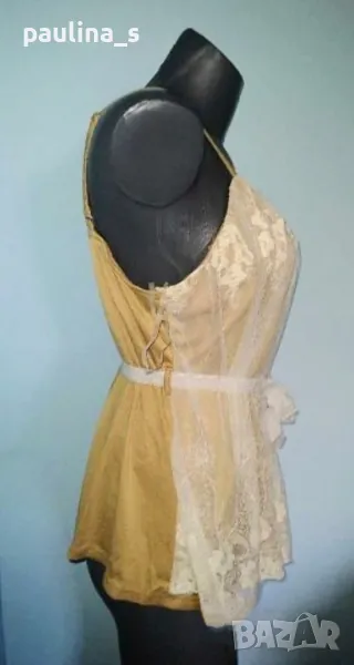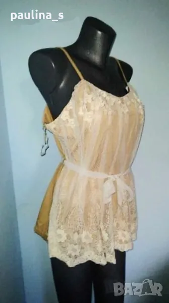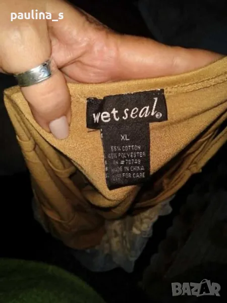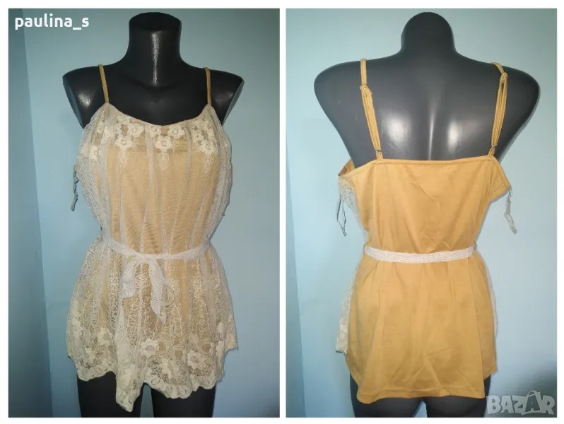 3. Колаж / L / 2XL - Туника / топ с декорации от дантела "Wet seal". Цената е крайна 19,99лв. Еластична памучна туника с декорации от дантела в предната част. Като нова, без дефекти. Материята е памук с примеси, еластична и покрива няколко размера, само един брой. Талията се регулира с дантела, презрамките също.