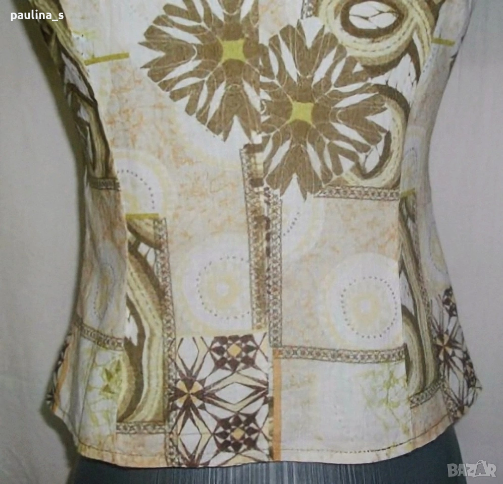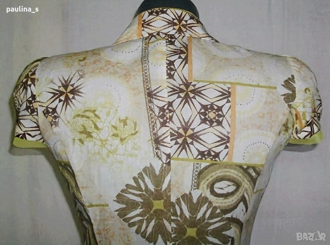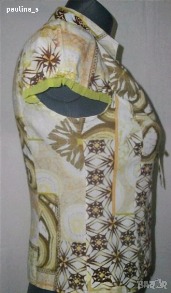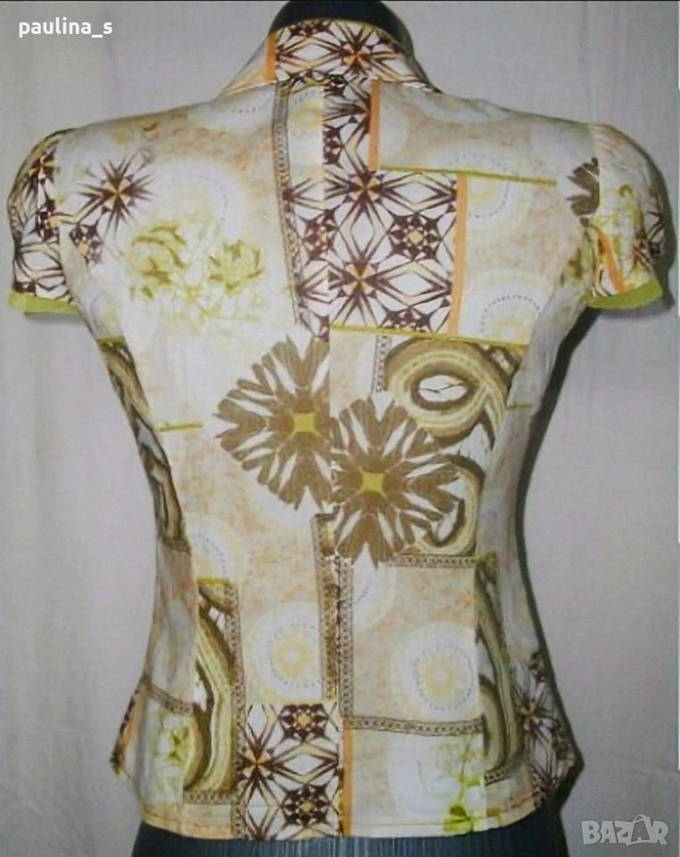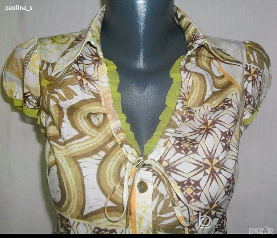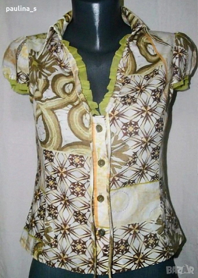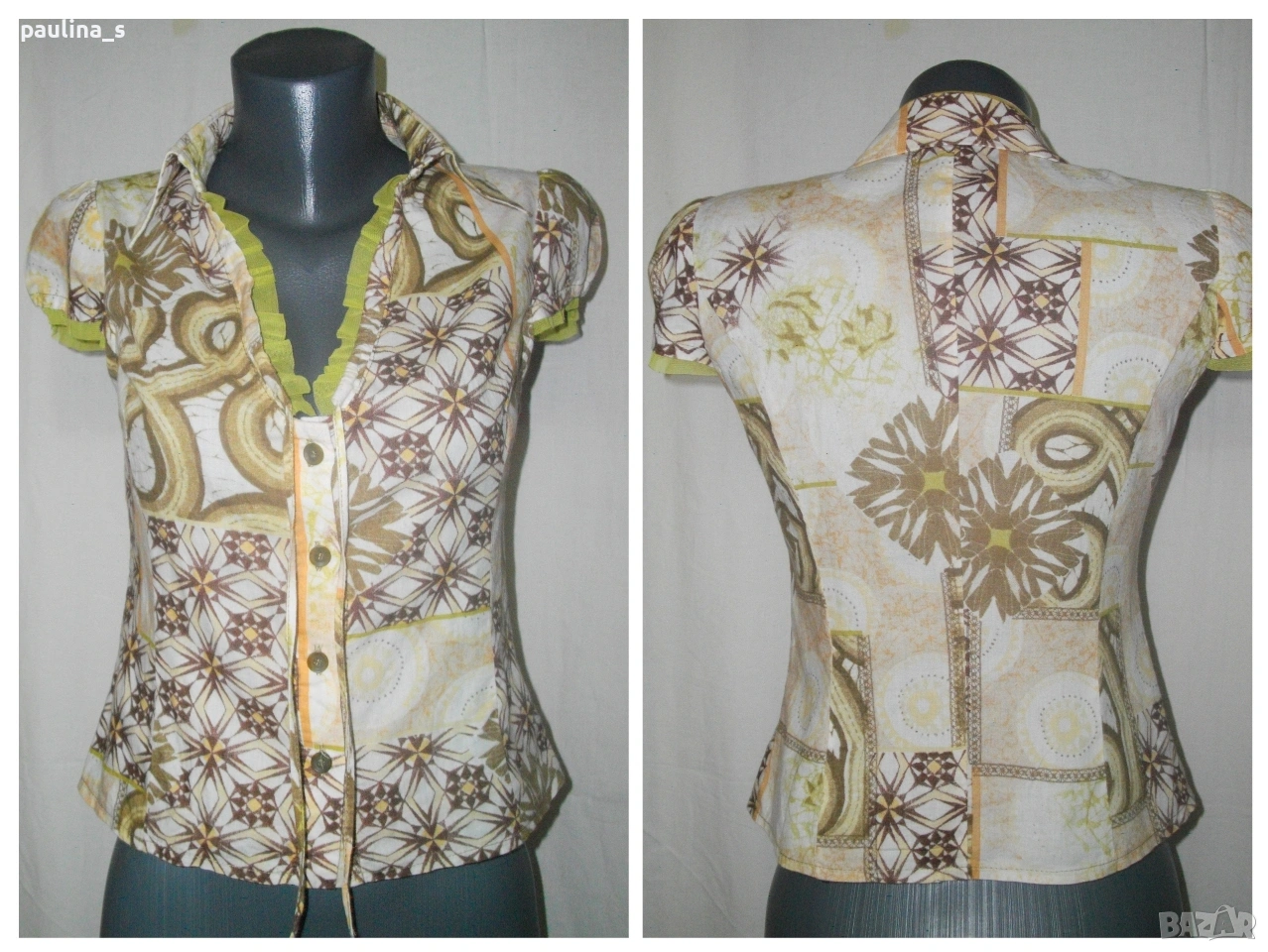 2️⃣ S / M / Колаж / Пъстра памучна риза тип бюстие, България. Цената е крайна 10 евро. Има декорирано деколте и вталяване, има и връзки отпред за коригиране на бюста, декорациите са от тюлени волани на деколтето и ръкавите. Ръкавите са къс буфон, копчетата с в същата цветова гама. Перфектна, дрехата гали сетивата и приковава погледите, не е чисто нова, но е без дефекти.