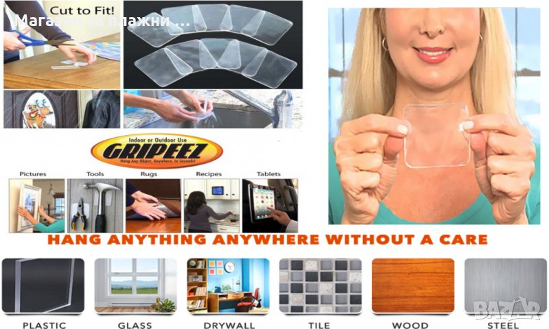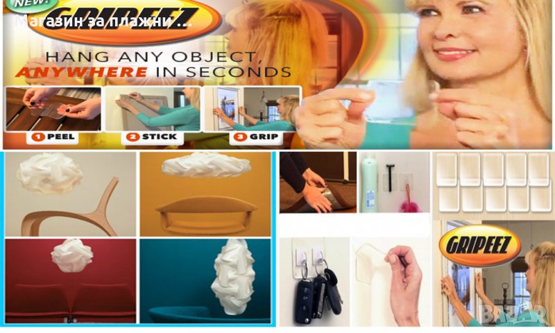Gripeezса 5 броя универслни държачи, коитоса подходящи за всякакви предмети до 3 кг. като - картини, карти, декорации, таблети, мобилни телефони, ключове, инструменти и още много други, асъщо така могат дасе използват и върху всякакви повърхности -стъкло, дърво, метал, пластмаса и др. Всичко, което трябва да направите е да ги изрежете по желания размер, да ги намокрите исложите върху повърхността и отгоре да поставите предмета, който щесе залепи веднага за тях.