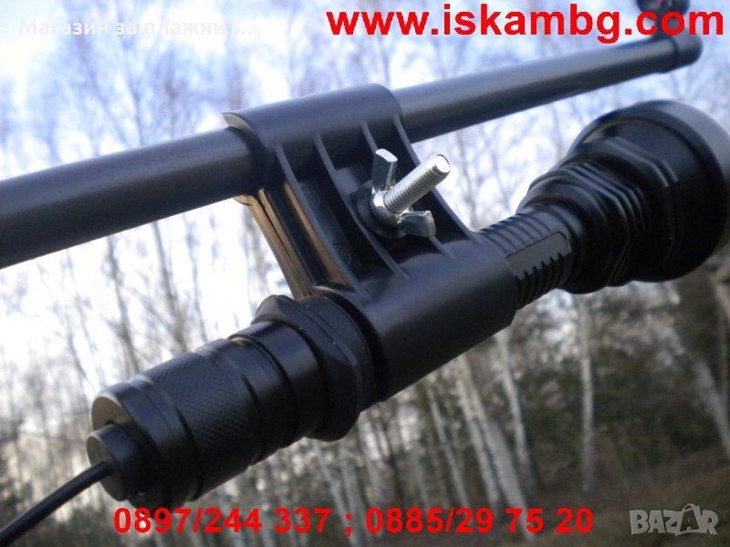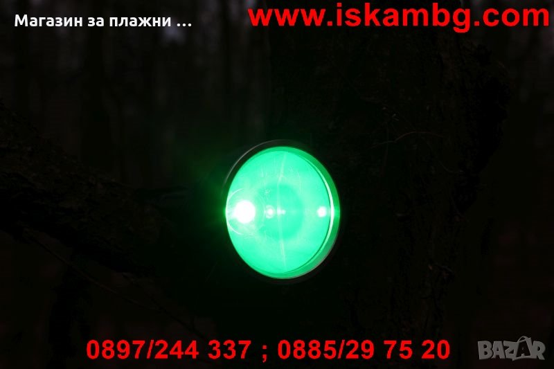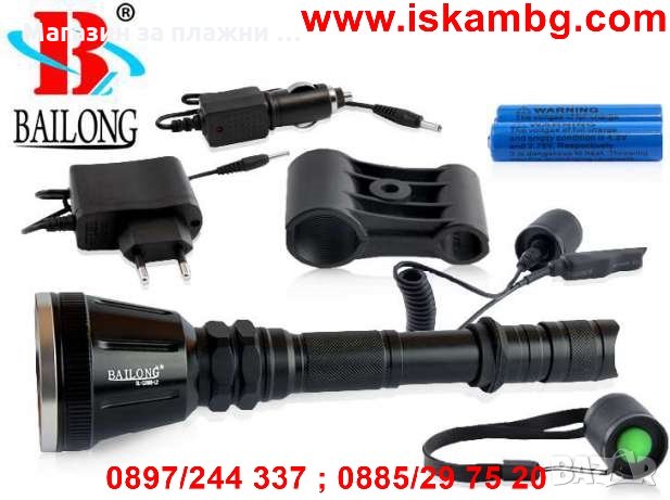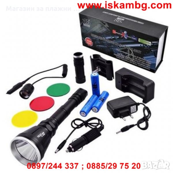 Мощен ловен фенер за монтаж на оръжие, комплектован с дистанционен бутон с кабел, три цветни филтъра и крепеж.