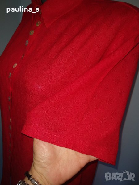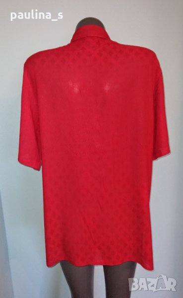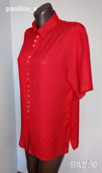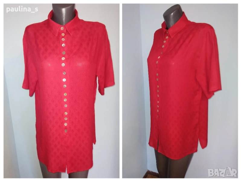 1️⃣ L / XL - "c. h. i. c. c.". Цената е крайна 34,99лв. Туника тип риза в ярко червено от релефна вискозна коприна. Копчета са кралски седеф - Абалон, поставени в двойки, само те са на цена по-виска от обявената, използват се като бижута. Дрехата е много впечатлителна и елегантна. Покрива дрескода за офис или повод.