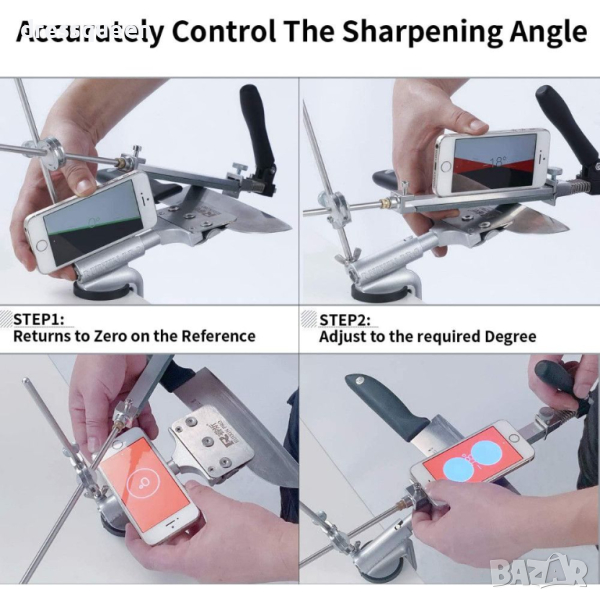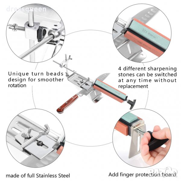 С професионалното точило за ножове от висококачествена стомана ще забравите за затъпените ножове в кухнята и няма да се притеснявате. Този иновативен уред се поставя върху кухненския плот и заточва перфектно за секунди всякакви видове остриета – гладки, назъбени, дори и най-захабените. Ъгълът на заточване се регулира от 5 до 9 градуса. Изключително удобен и стабилен, уредът няма да се пързаля по кухненския ви плот докато точете ножовете си. Може да се използва и за остриетата на ножици. Уредът има 4 плочки Грит 120, 320, 600 и 1500 за заточване и така само за няколко секунди ще имате остри като бръснач остриета, готови за работа. Направен изцяло от висококачествена стомана, точилото никога няма се повреди и ще издържи с години.