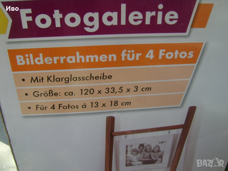 Размерите на рамките за снимки и на самата стойка са видими от снимката.Лесно се сглобява посредством четри винта.
