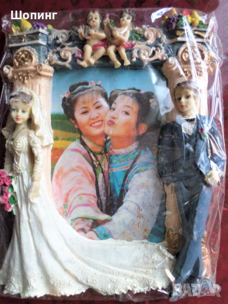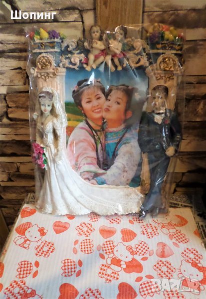 Чисто нова, в кутия и целофанена опаковка. Солидна, много красива и изразителна 3D статуетка - поставка за снимка с много детайли - "Младоженци". Прецизна изработка с внимание към всеки детайл, ярки цветове, множество орнаменти - с булка и младоженец, ангелчета и кошници с цветя. Снимана е с опаковката, отблясъците са от найлона. Масивна е, отзад има стойка за поставяне. Размери: 25 см на 20 см.