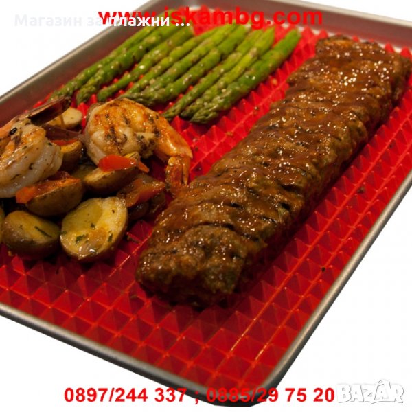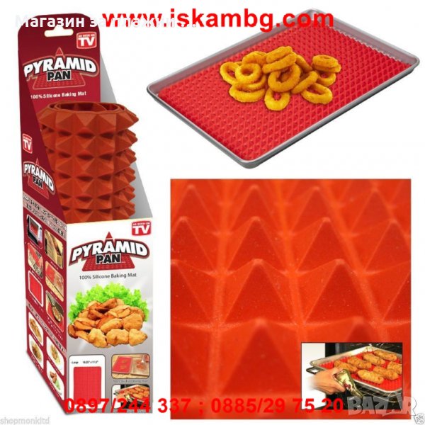 Новата революционна пирамидална структура позволява на въздуха да циркулира под храната с цел равномерно разпределение на топлината. Така храната става сочна и хрупкава без да е необходимо да се обръща. Pyramid Pan отцежда излишната мазнина между мини пирамидките. Силиконовата повърхност не позволява залепване на храната и е лесна за почистване.