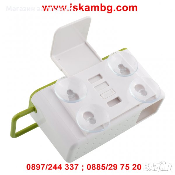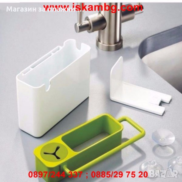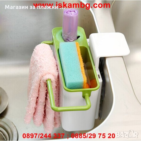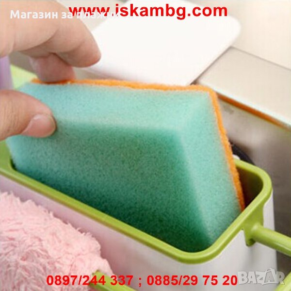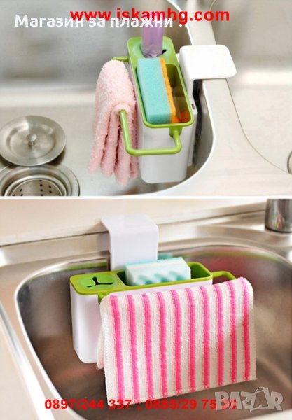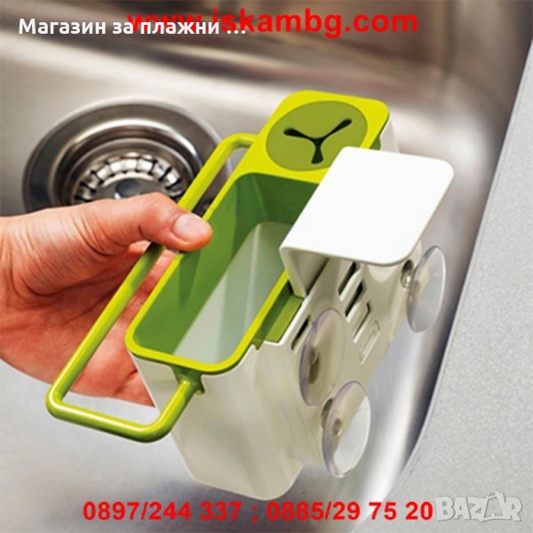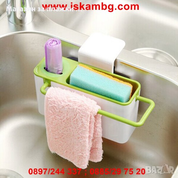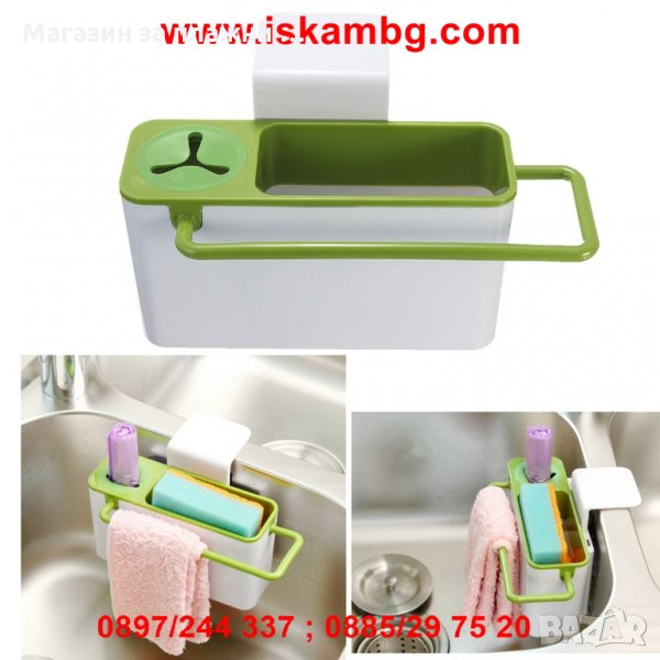 Иновативен органайзер за мивка, който се изцежда сам директно в мивката. Умно, нали? Използва се, за да държи кухненската гъба, четката за чинии или всяко друго приспособление в кухнята. Със специално място за кърпата за подсушаване на чиниите.