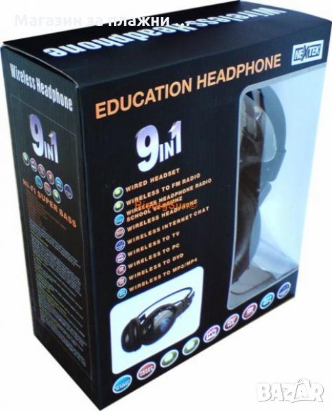 С тези Безжични 9-в-1 Слушалки Вашият домашен мултимедиен център ще бъде напълно завършен. Този невероятeн дигитален комплект комбинира в себе се цели 9 различни устройства на цената не едно! Тази джаджа се състои от двa основни компонента - Безжични Радио Слушалки (Приемник) и Безжичен Радио Трансмитер (Предавател). С безжичните слушалки можете да слушате каквото си пожелаете на спокойствие, без никой да Ви безпокои. Просто свържете предавателя към желаното устройство (компютър, телевизор, МР3 плеър, CD, DVD плеър и т.н ) и вече можете да се радвате на качествен звук без да сте ограничени от досадните, вечно заплетени кабели! В Безжичните слушалки има и вграден ФМ радио приемник, което значи че можете да слушате любимото си FM радио навсякъде и по всяко време. Същевременно можете да използвате комплекта и за онлайн чат разговори, като ползвате вградения в предавателя микрофон . Можете да използвате тази невероятна джаджа и като подслушвателно устройство или Бебефон - просто поставете предавателя на желаното от вас място и ще можете да чувате това което става около него .Или ако желаете можете да сържете безжичните слушалки и с аудио кабела ,включен в комплекта и така ще можете да ги ползвате и като обикновени жични слушалки .