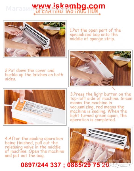 - С натискане на втори бутон машината за вакуумиране освобождава вече готовата торбичка и продуктът е готов за съхранение;