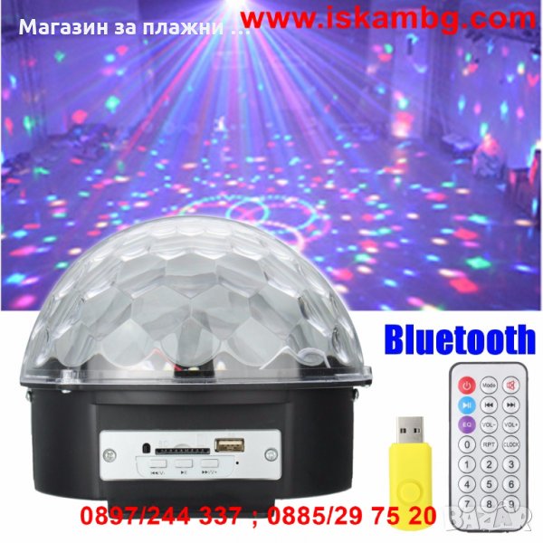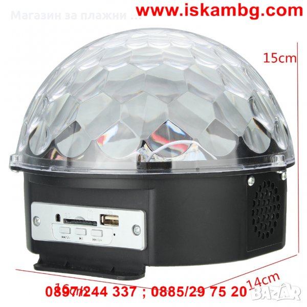Музикална диско система с вграден усилвател и лампа поддържаща MP3 музикален формат. Високо качество на изработка и ергономичен дизайн. Контрола на звука, смяна на песните и светлинните ефекти се контролират от комбинирани бутони.