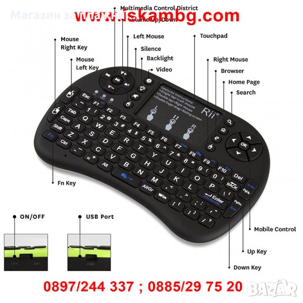Мултифункционална Клавиатура Rii i8 с бутони мултимедия. Клавиатурата разполага с 92 бутона , които включват и контола в/у различни компютърни игри. Клавиатурата се базира на свързаност през bluetooth и е съвместима с Playstation 3, HTPC, Smart TV, TV box, Windows 2000, Windows XP, WIndows Vista, Windows CE, Windows 7, Windows 8, Linux(Debian-3.1, Redhat-9.0, Ubuntu-8.10, Fedors-7.0 tested), Androis OS (със стандартен интерфейс USB).