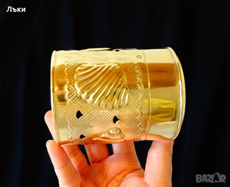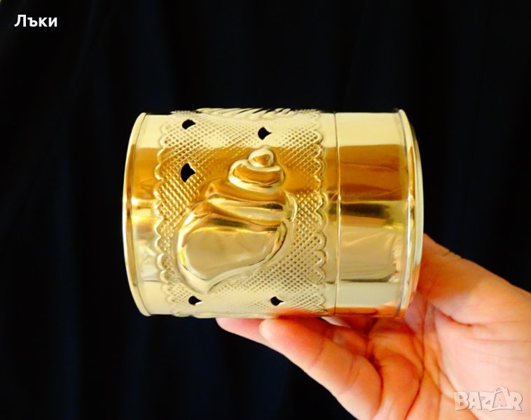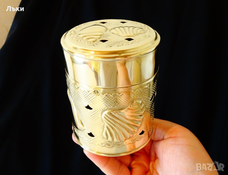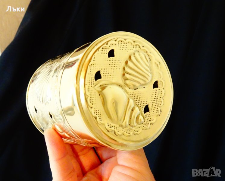 Старинно белгийско кадило, кандило, кадилница, тамянник, майсторска ръчна изработка от златен бронз.Красиво декорирана с релефно ковани океански мидички,рапанчета,нежни орнаменти и ажур.Височина 10 см.,диаметър 8 см.,тегло 110 гр.