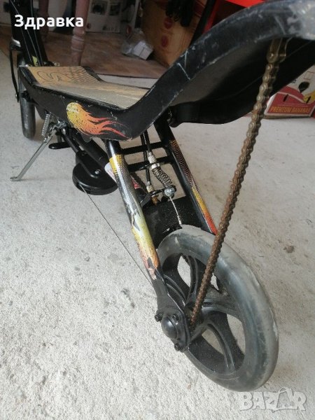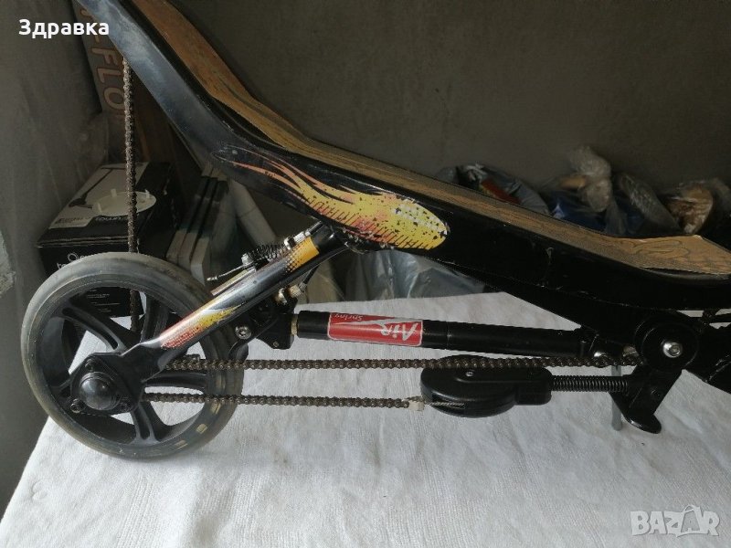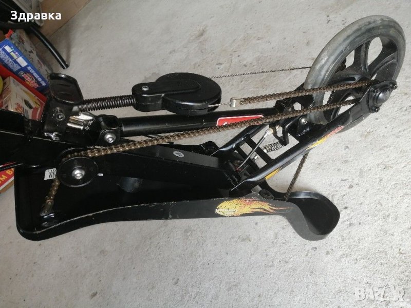 УНИКАТ НЕМСКА ТРОТИНЕТКА. Задвижва се чрез верига. Водача, прикляква, първо с предния крак на платформата като я натиска надолу, тя се издига нагоре, и после със задния край се натиска надолу. Така тротинетка се придвижва напред. Има ръчна спирачка за спиране. Става както за деца, така и за възрастни. Товароносимост до 100-110 килограма. Цената е крайна. Мога да Ви го изпратя по Еконт.