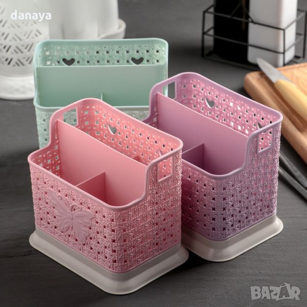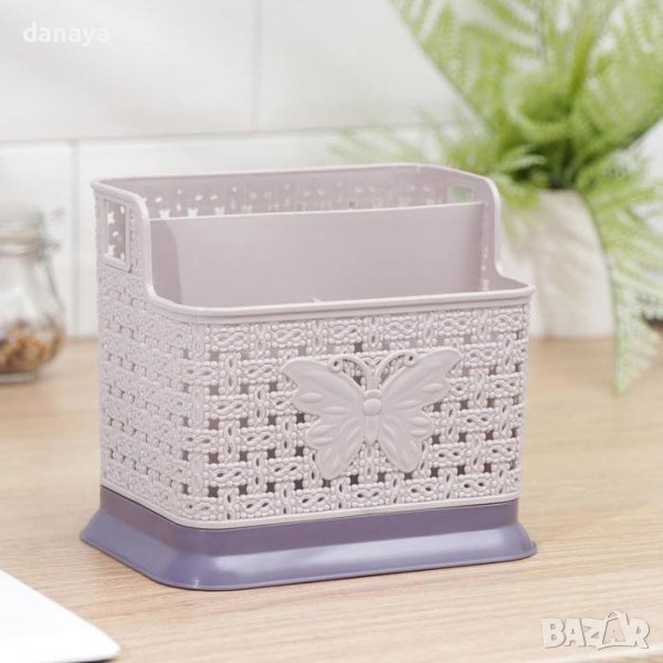 Поставка за прибори. Сушилник за вилици, лъжици и други кухненски прибори. Органайзер за прибори с 4 отделения за лесно подреждане. Изработен от пластмаса, декориран с красива пеперуда в центъра си. Предлага се в различни цветове.