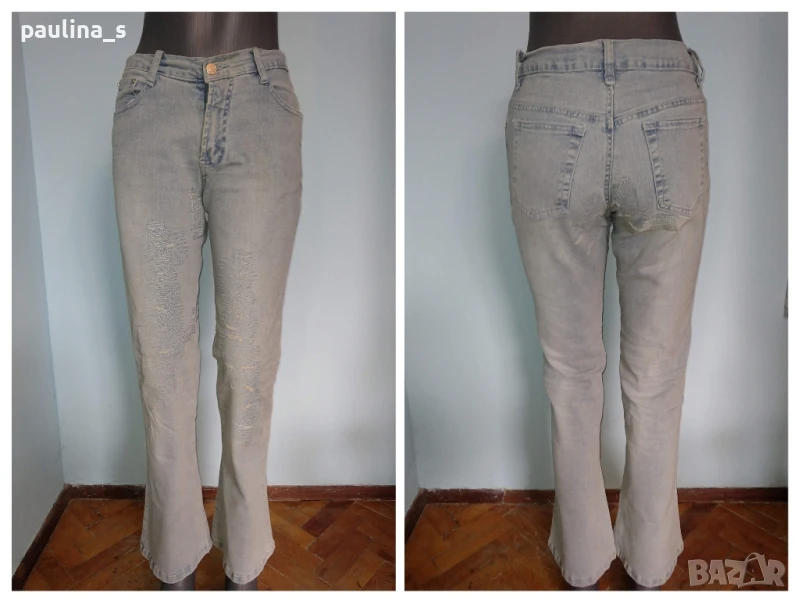 2️⃣. Колаж / Винтидж / Накъсани дънки с висока талия и широки крачоли bootcut. Цената е крайна 24,99лв / 12,5 евро. М / XL - Еластични накъсани дънки с висока талия, избелващ ефект и широки крачоли. Моделът е 5 pocket Denim с крачоли bootcut или чарстон.