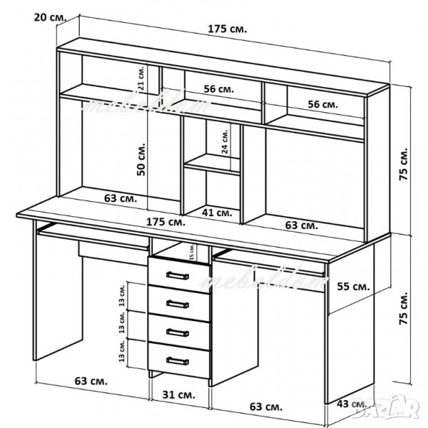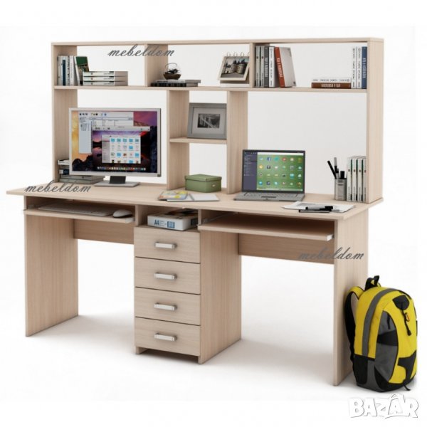 Бюро 175см. за двама с надстройка,4 чекмеджета и 2 клавиатури(код-1109) поставяне: до стена,бюрото е еднолицево
