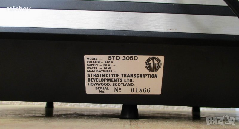 Strathclyde Transcription Developments STD 305D – Качествен и красив Шотландски грамофон с Британско рамо - SME Series III. Три скорости – 33,45 и 78 оборота. Задвижване белт драйв. Масивна и стабилна конструкция. Вграден нивелир. Размери – 474 x 364 x 156mm. Тегло около 15 кг. Производство от 1978г. Предлага се без доза,но при желание разполагам с цялата гама на Ортофон.Плащате доза по избор а монтажа и настройката са от мен. Перфектен визуално и технически. В момента се предлага за 2000 паунда. – 1590 лв.