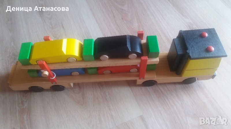 3) Дървен автовоз на два етажа с 4 колички с различен цвят, дължина 36 см, почти не е играно с него - 20 лв.