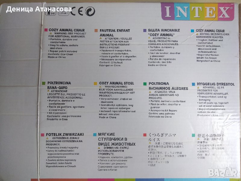 2) Детски надуваем фотьойл кресло светлосиньо бухалче, предната част е спукана и постепенно спада, но има лепенка, ако някой може да го залепи и да се ползва нормално - 5 лв.