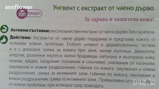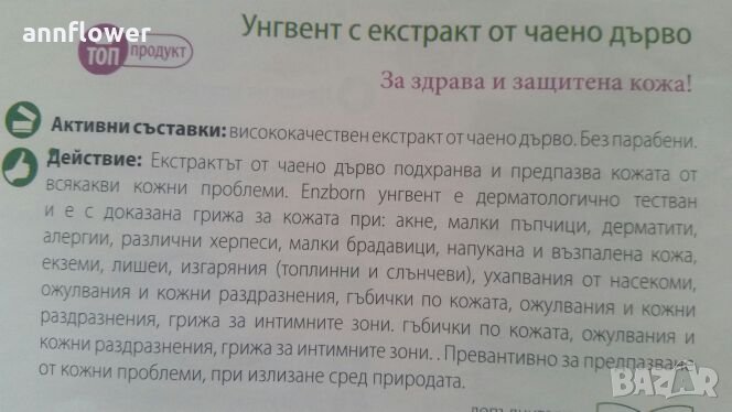 Екстрактът от чаено дърво подхранва и предпазва кожата от всякакви кожни проблеми. Enzborn унгвент е дерматологично тестван и е с доказана грижа за кожата. Запазва влажността й и я предпазва от изсушаване и вредното въздействие на околната среда. Има репелентно (отблъскващо) действие срещу насекоми.