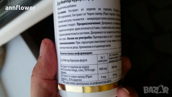 Всяко капсула съдържа: екстракт от корени на куркума (95% куркумин) - 400 mg; Екстракт от Черен пипер (95% piperin) - 5 mg.