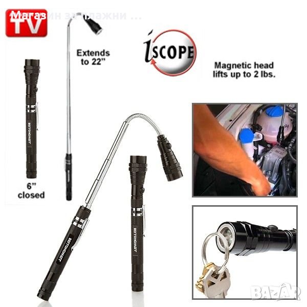 Мултифункционално диодно фенерче с 3 диода, с телескопична дръжка (с дължина от 17 до 57 см) и метална магнитна глава за осветяване и на най-недостъпните места и прибиране на всякакви метални детайли.