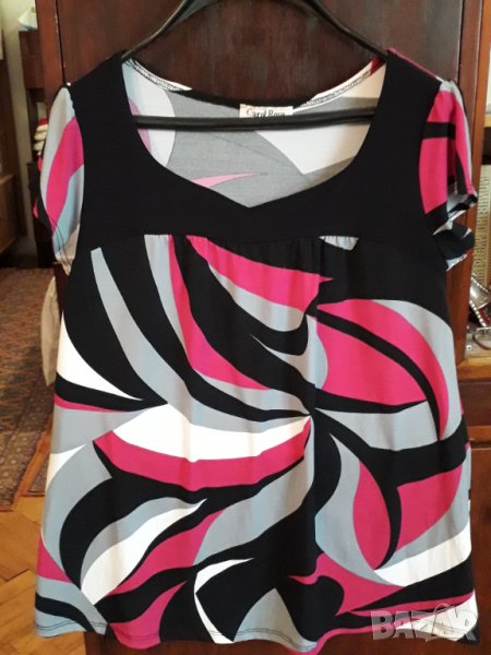 Дамска еластична блуза с късо малко ръкавче, цвят комбинация от черно, циклама, сиво и бяло Размер М-Л рамене 40 см, има платка отпред и набор над гърдите свободно падаща, бюст 50 см /обиколка 100 см, дължина 62 см. Блузката е много запазена, като нова. Отговарям на съобщения тук, изпращам с куриер с отстъпка или лично предаване в София.