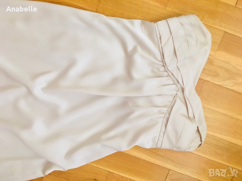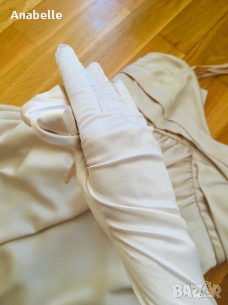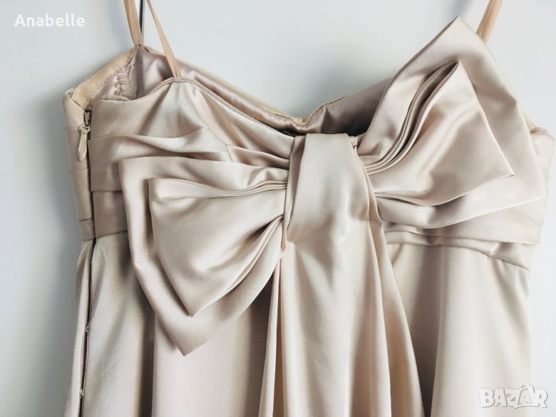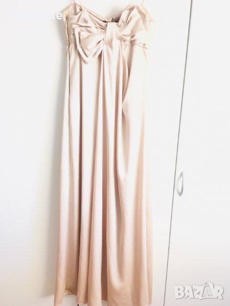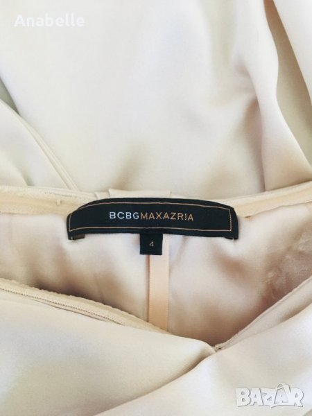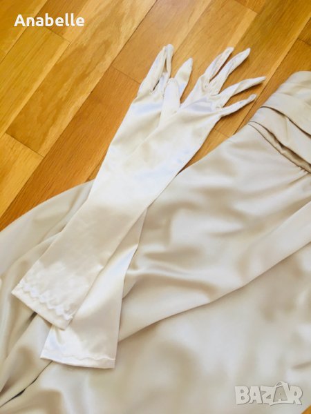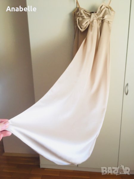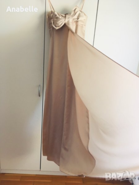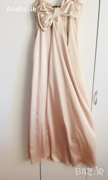 Много красива, елегантна, изчистена сатенена вечерна/бална рокля на марката BcBg MaxAzria. Цвят: шампанско. Без презрамки, с шини (тип корсет) и силиконова лента в горната част - държи и със и без сутиен. Има асиметрична пандела на гърба и воал, богата на плат. Дължината е до пода, леко се влачи (зависи от височина, обувки, т.н.), но не се оплита, не спъва. Размер: 4 (S, става и за М). Носена е 2 пъти - по повод и за 15-20 мин за снимки. Към роклята подарявам чифт сатенени ръкавици, S размер, до лакът.