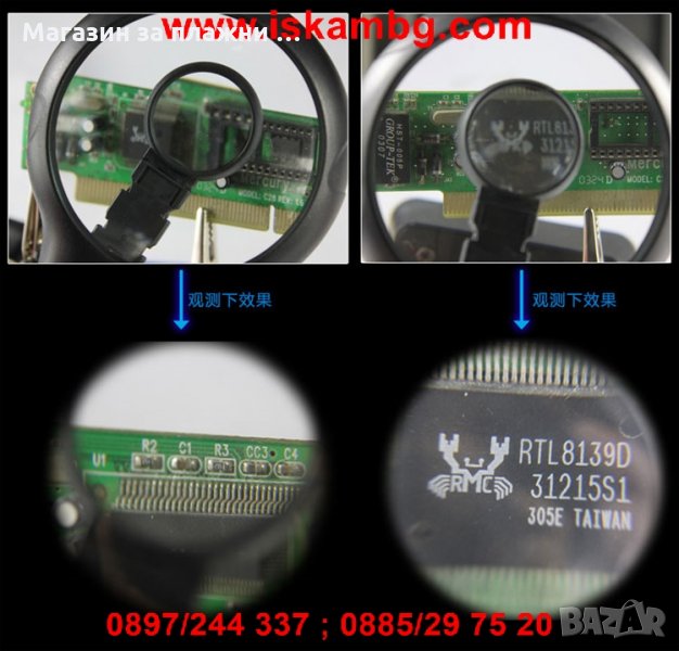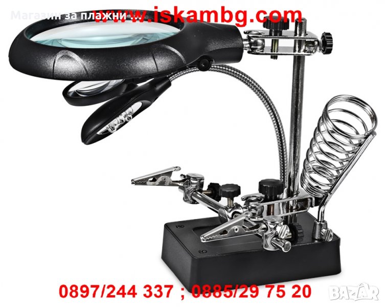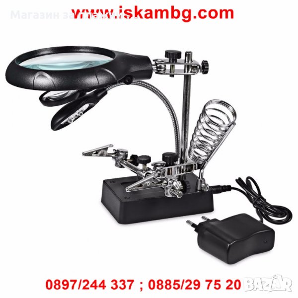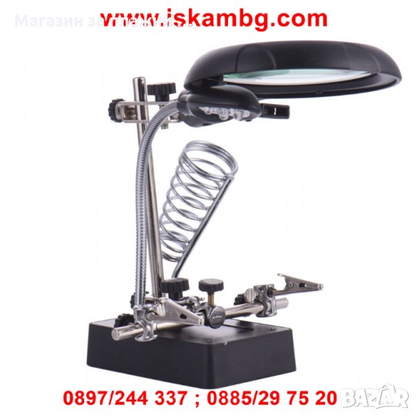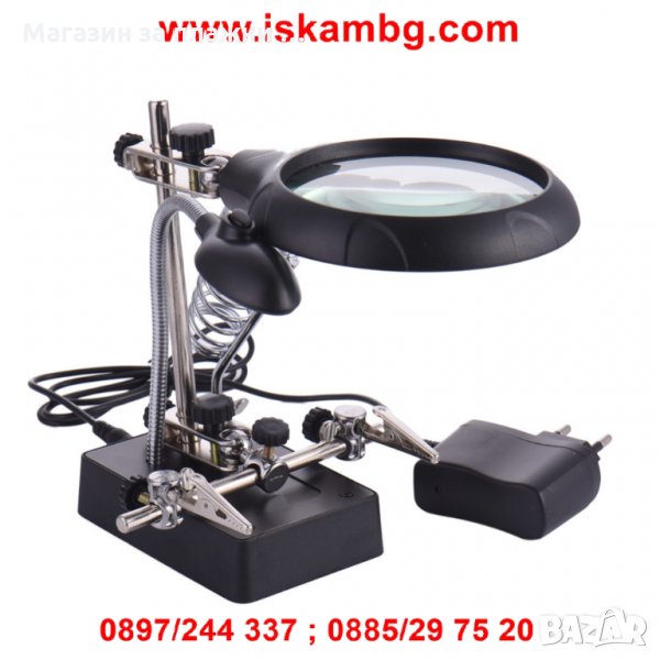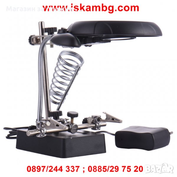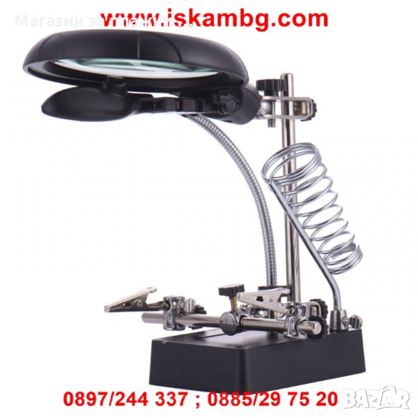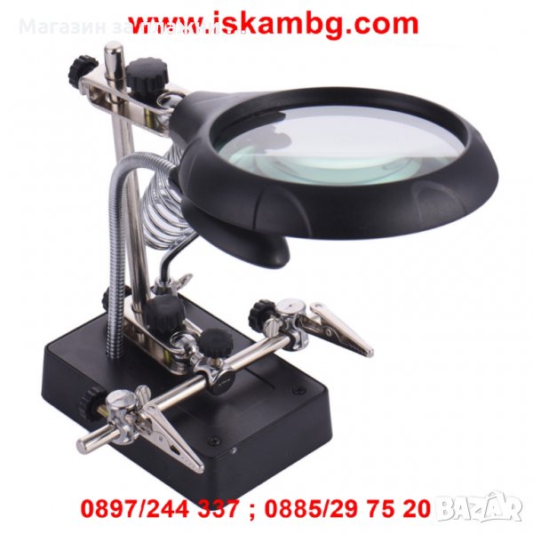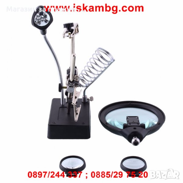 Работейки с малки предмети, в процеса на запояване на малки части или микросхеми често се сблъскваме с проблема, когато двете ни ръце не са достатъчни за удобна и дълга работа. Ръката се уморява да държи елемента под ъгъл, който създава дискомфорт както за зрението, така и за предстоящата работа. В такива моменти на помощ идва третата ръка с лупа и осветление. Тя ни позволява да фиксираме частта неподвижно с помощта на скобите(крокодил), а висококачествените лещи осигуряват перфектно увеличение на обекта без значение размерите му. Включени са две допълнителни мини-лещи, които са инсталират под основната и имат диаметър 35 mm и увеличението им е 2х или 5х. Третата ръка има led подсветка, която свети ярко (5 светодиода) и се захранва както от батерии, така и от 220V.