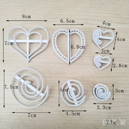 7 бр сърца и въртели пластмасови резци форми украса фондан торта декор → Обява 28594670