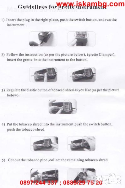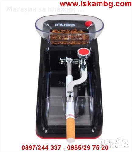Машинката може да се регулира колко плътно или по-рохкаво да пълни цигарената гилза! Лесна за употреба! Гилзата за цигари, се нанизва на металната тръба, в която винтова пружина придвижва тютюна. Конструкцията е на класическа шнекова, винтова-пълначна машина. Машинката е с добро ниво на технология, и дава висока производителност и качество. Машинката разполага с въртелив бутон който регулира усилието на пружината, която притиска празната гилза. При по-хлабав натиск на тази пружина тютюна в цигарената гилза бива напълнен по-рехаво.При по-силен натиск на пружината цигарената гилза се пълни по-плътно. Производителност: до 5 цигари в минута