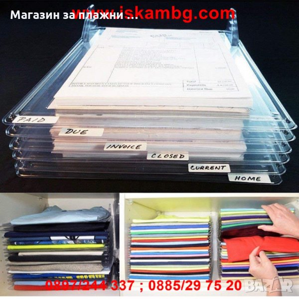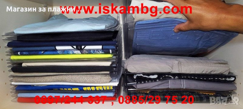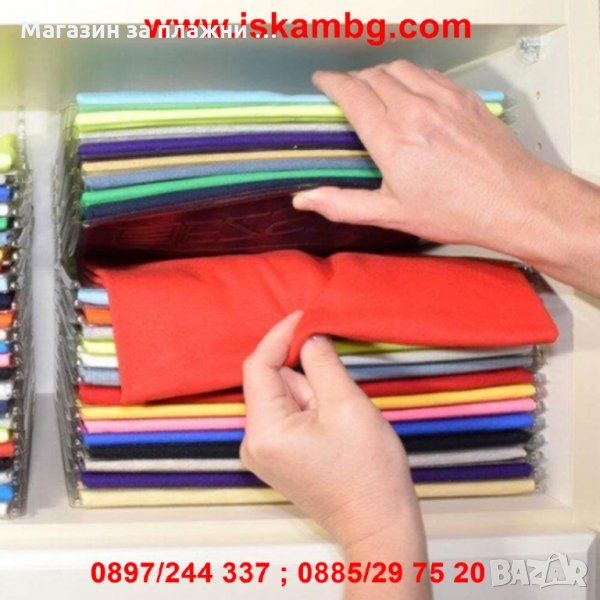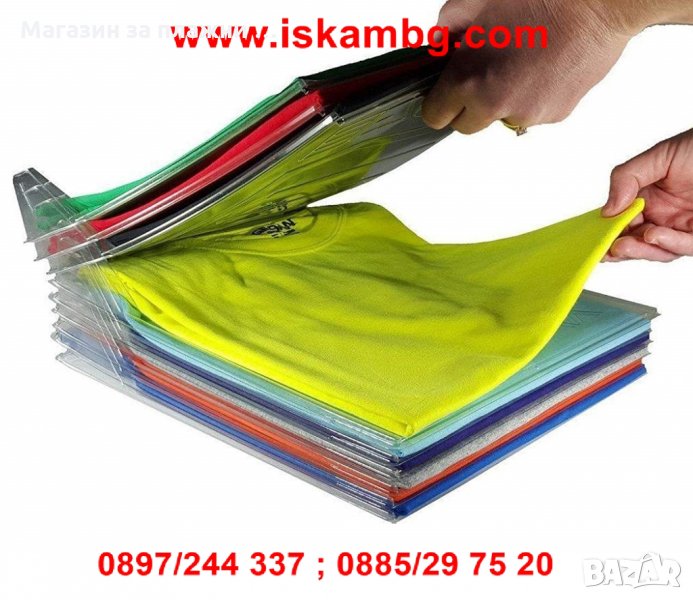 На всеки се е случвало - идеално подреден гардероб, и когато решите да си вземете нова тениска, любимата ви се оказва в средата на купчината, дръпвате я и цялата подреденост отива на кино. За да не подреждате и сгъвате всеки ден, вземете този простичък но уникално ефективен органайзер! Състои се от десет части, влизащи една в друга, които поддържат тениските ви идеално сгънати и подредени дори когато си вземете една от средата! Супер практичен, удобен, за подреден и организиран гардероб и освен това е идеален за пътуване! Просто вземате купчината и слагате в куфара! Дори децата се справят чудесно с подреждането! Сложете край на разхвърляните и набутани безразборно дрехи в гардероба!