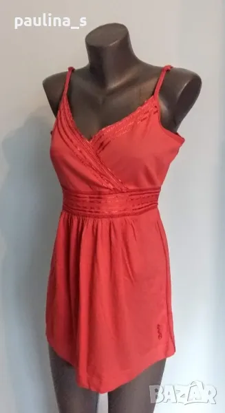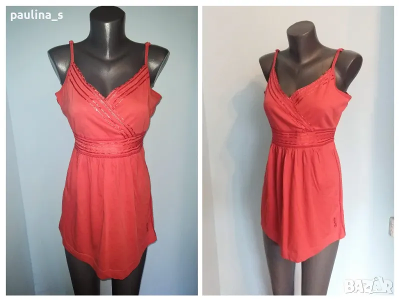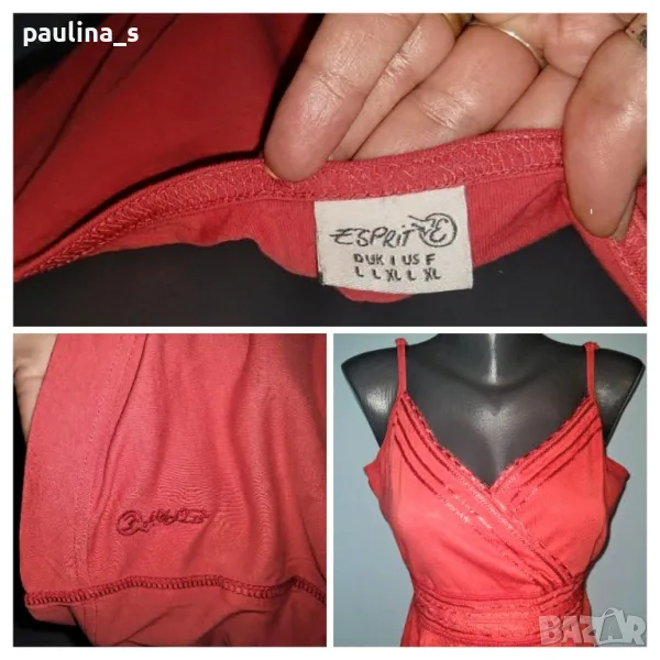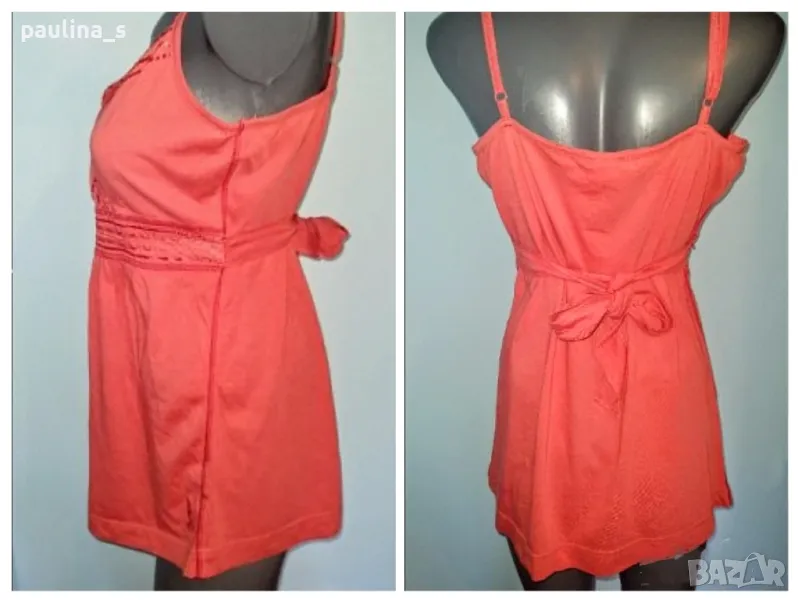 3. Колаж / L / 3XL - Цвят праскова "Esprit". Цената е крайна 24,99лв. Брандова туника с бродерии и декорации от сатенирани конци с прекръстосано деколте. Материята е 100% памучно трико и има еластичност, покрива няколко размера. Презрамките се регулират, подгръдната обиколка също с колан отзад. Цветът е екзотичен, дрехата перфектна. Нова, без дефекти и етикет.