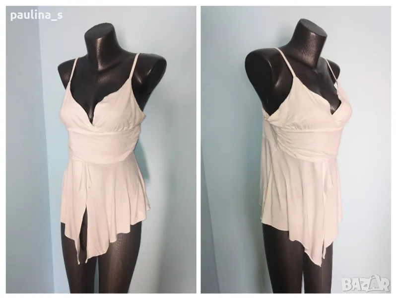 1. Колаж / L / 2XL / Бяла - "H&M". Цената е крайна 9,99лв. Еластична туника с бюстие в горната част и прекръстосващи се чашки. Материята е вискоза и памук, доста еластична, хипоалергична и покрива няколко размера. Моделът е шик и може да се носи на голо и на плажа.