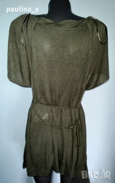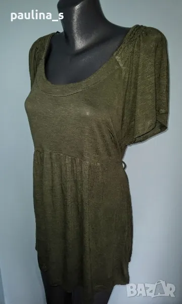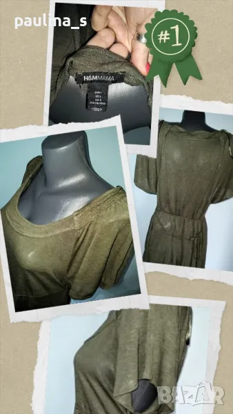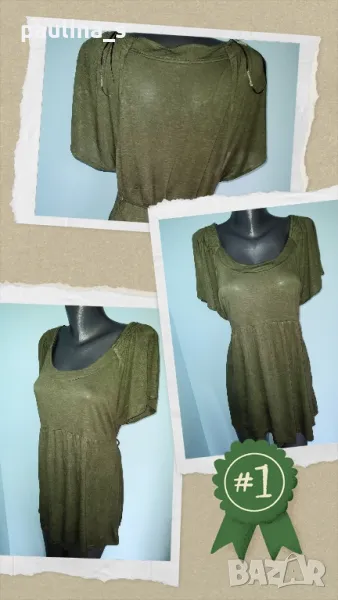 2. Колаж / XL / 4XL / Зелена "H&M". Цената е крайна 14,99лв. Брандова еластична туника от фино еластично трико, вискоза и памук. Моделът е с платка, обло деколте, крилати реглан ръкави и набор под платката. Подходяща е и за бременност. Ширината се регулира с шнур.