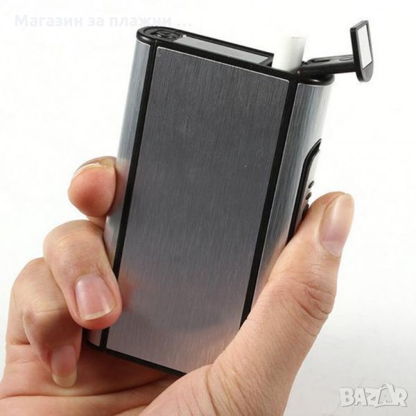 Табакера с механичен изтласкващ механизъм за подаване на цигари. Табакерата побира 10 насипни цигари с дължина 80 милиметра. Материал: пластмаса. Размери: 2.1 - 6 - 10 сантиметра. Цвят: тъмно сребро.