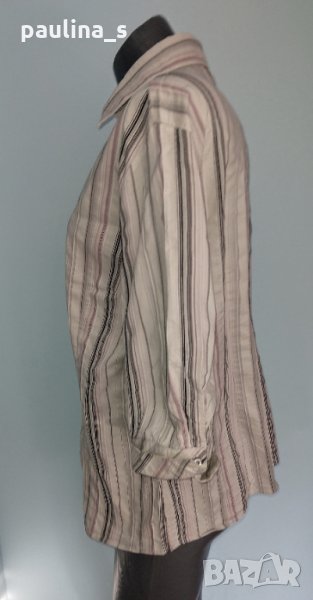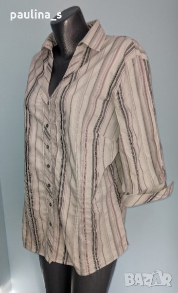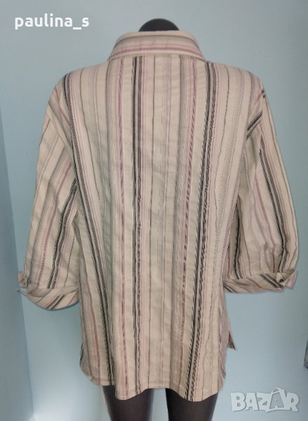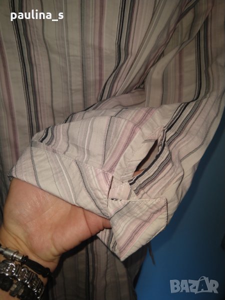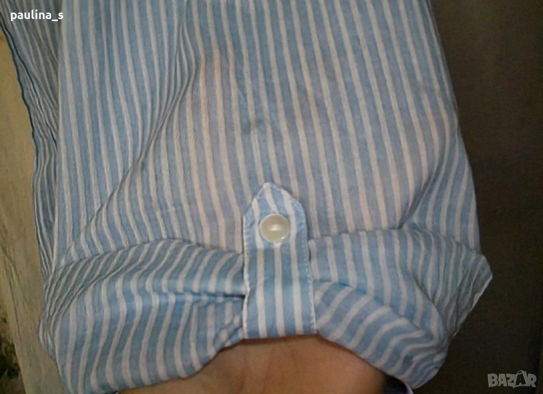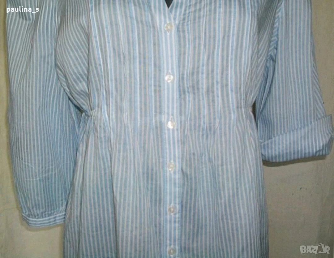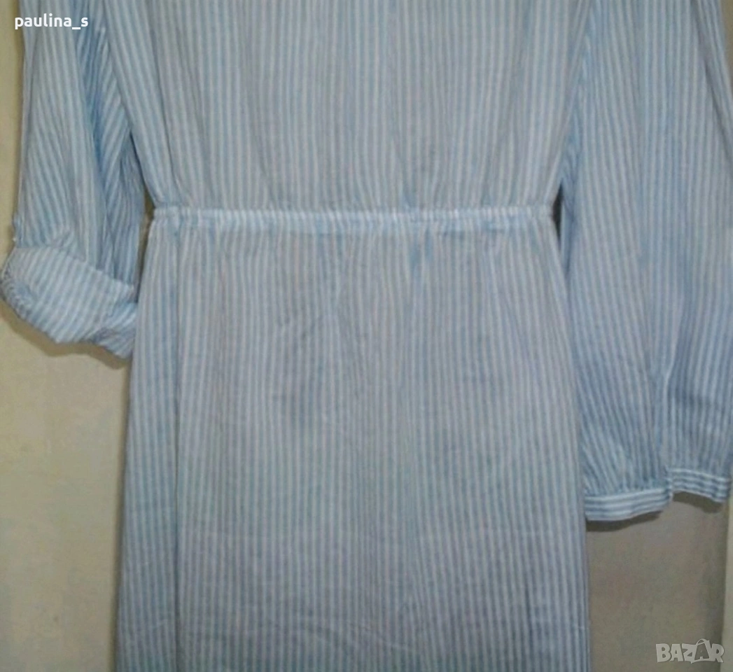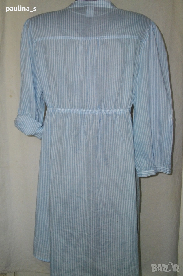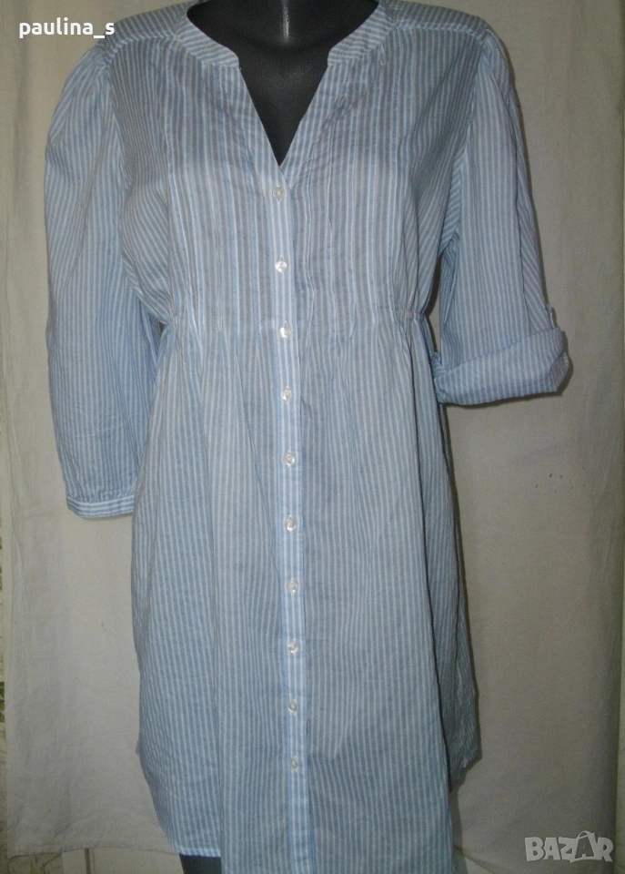 2️⃣ XL / 2XL - "H&M". Цената е крайна, без пазарлъци 20 евро. Дамска риза тип рокля, от изключително фин индийски памук, с прозрачност. Десенът е на дискретни вертикални синьо-бели райета, закопчаването е отпред с перлени миниатюрни копчета, като малки бижута, висока яка, дълбоко деколте. Ръкавите са буфон с регулация. Наборът е под бюста с ластична лента, надолу пада свободно със заобляне в краищата. Изключително удобна и практична дреха, като нова!