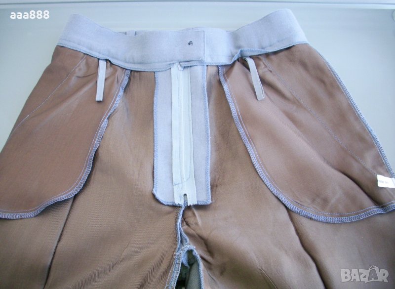 Панталонът е в класическа права кройка с ръб. Коланът е прав, подплатен. Закопчава се с копче на талията и цип отпред, има пет гайки за колан. За добро прилягане отпред има по два пенса, до тях два дълбоки джоба за ръце с подплата от полиестерна коприна. Отпред изцяло е подплатен с полиестерна коприна за по-добра визия.
