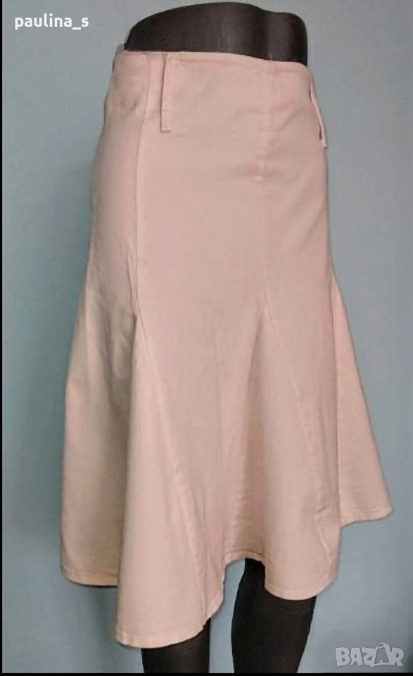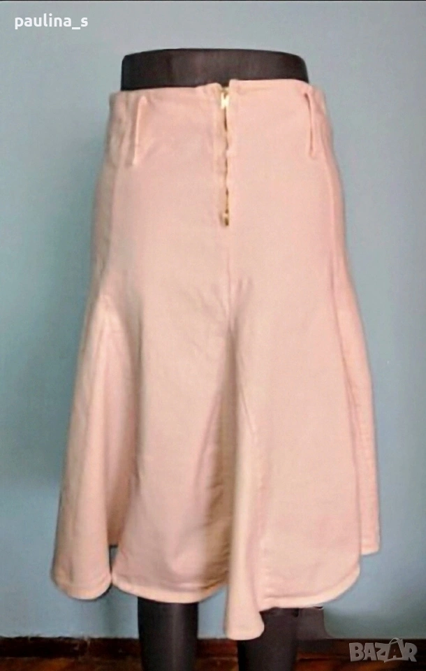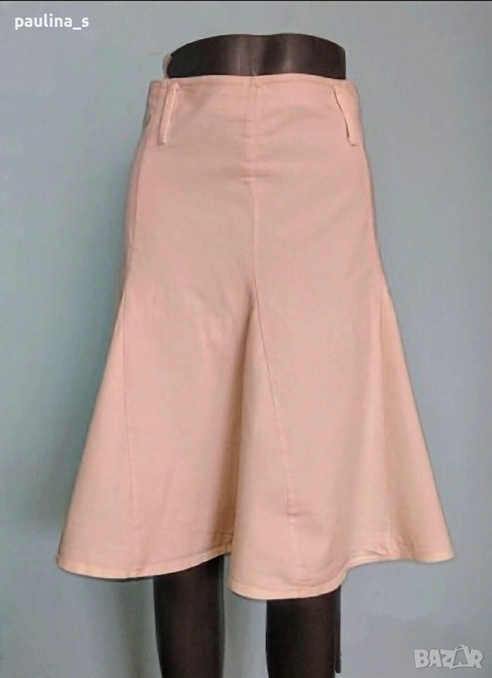 2️⃣. Колаж / M / L - Еластична дънкова пола в бледо розово. Цената е крайна, без пазарлъци 7,5 евро. Еластична пола с висока талия и клиновидно разкроение. Материята е тънка дънкова - памук и ликра, доста еластична. Цветът е бледо розов, гайките са под горния тегел. Без дефекти.
