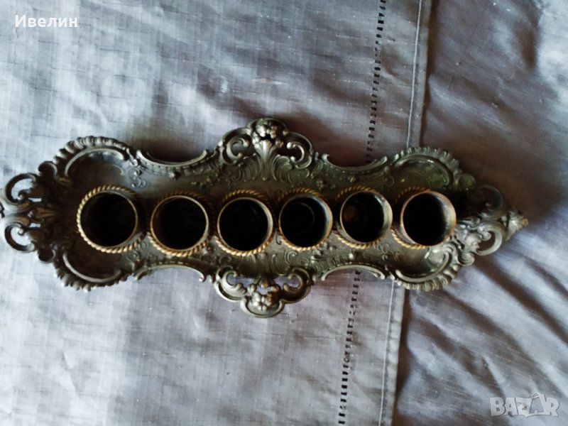 стара поставка с чаши за шот-уникат.масивен метален корпус,ръчна изработка с размери 34см/14см. ,месингови чаши с височина 4см.отвор 3см/едната е различна/.