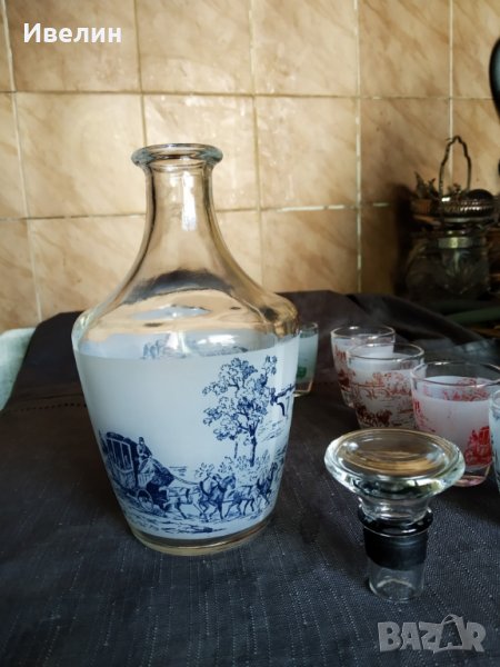 ретро сервиз за ликьор,ракия от стъкло.гарафата е висока 19см,7 чаши високи 5см,отвор 4см.съдът и всички са украсени с нарисувани пейзажи от стара франция.На дъното на всяка чашка има маркировка-,франция.