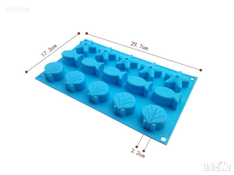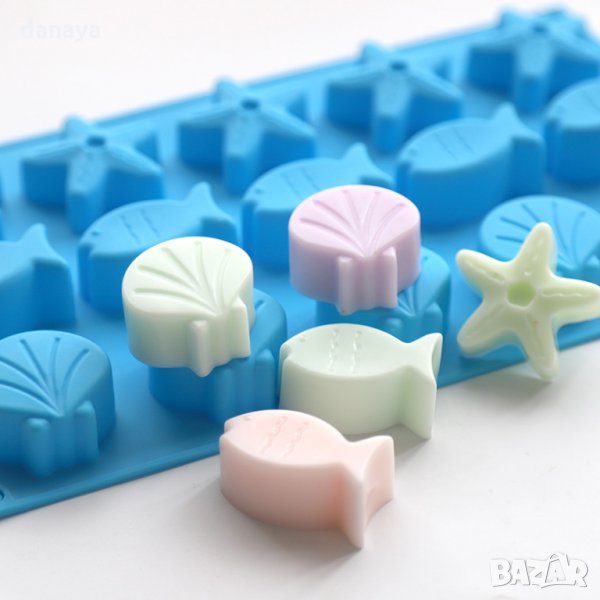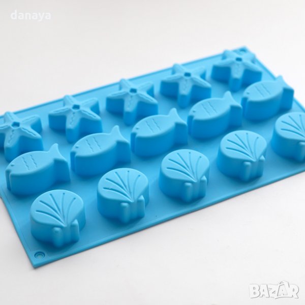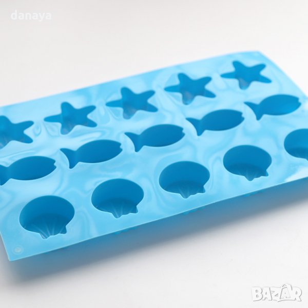Силиконова форма за шоколадови бонбони, бисквитки или дребни сладки с 3 различни формички - мида, рибка и морска звезда. Подходяща за печене и замразяване. 15 гнезда за приготвяне на 15 сладки едновременно.