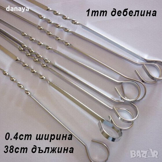 Обща дължина на един шиш: 38см; ширина на острието: 4 милиметра. Дебелина: 1 милиметър. Комплект от 10 броя.